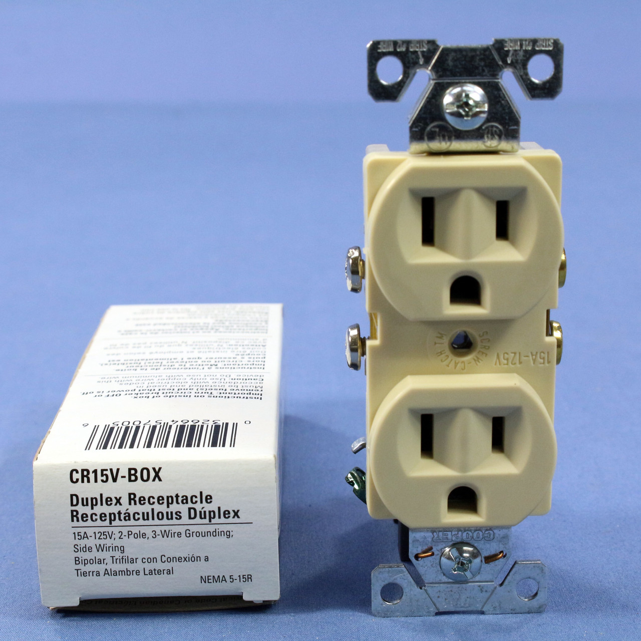Cooper Wiring Devices CR15V ivory duplex commercial receptacles. Commercial Specification Grade, NEMA 5-15R, 2-pole, 3-wire, grounding, side wired, rated 15A 125V. Each is individually packaged; packaging may differ from photos. Features include: