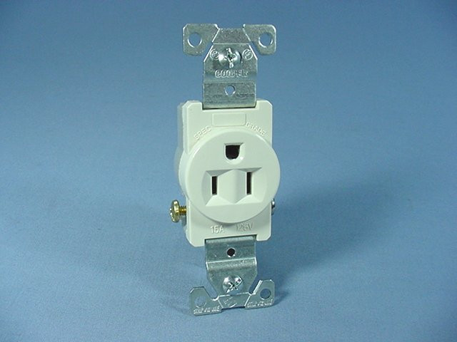 Cooper Wiring Devices 817LA light almond single outlet receptacle. The single outlet design is good for locations where you want to dedicate a receptacle/circuit to a specific machine or appliance: air conditioners, workshops, courtesy lights, refrigerators, etc. Commercial Specification Grade, NEMA 5-15R, 2-pole, 3-wire, grounding, side wired, rated 15A 125V. Features include: