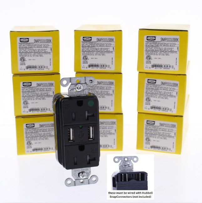 - 10 Hubbell Black Hospital Grade SNAPConnect 20A Tamper Resistant Outlet Receptacles 2.0 USB SNAP8300USBBK