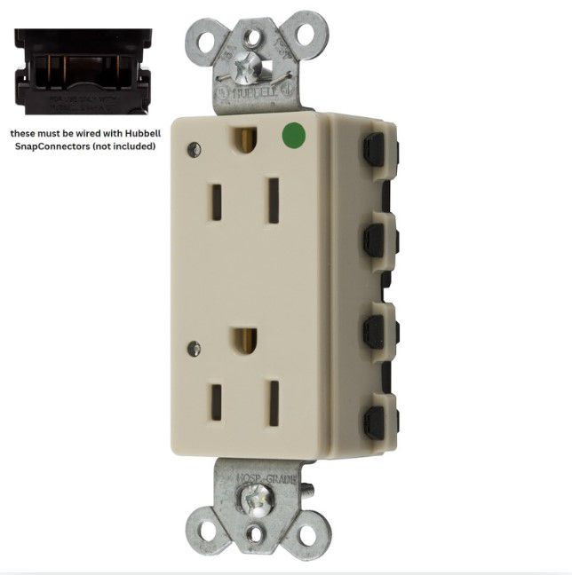- Hubbell SNAP2172IL Ivory SnapConnect Hospital Grade Duplex Outlet Receptacle LED Indicator 15A