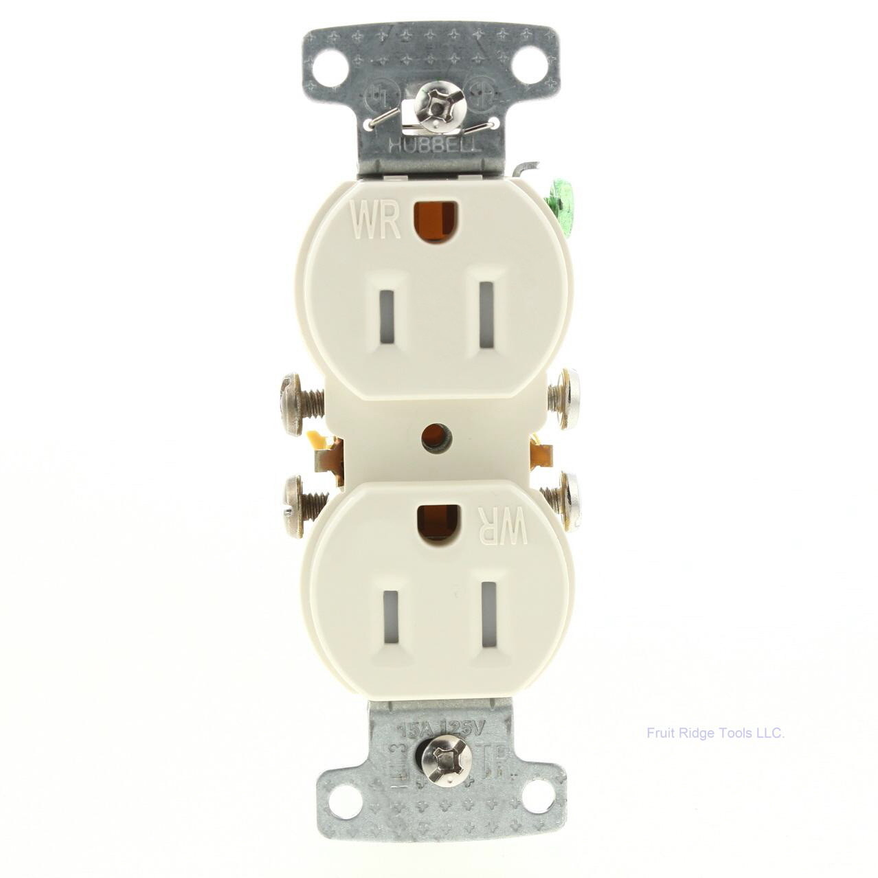 Hubbell RR15SLAWRTR light almond tamper and weather resistant duplex receptacle. Residential Grade, NEMA 5-15R, 2-pole, 3-wire, self-grounding, push-in and side wired, rated 15A 125V. Each is individually packaged. Features include: