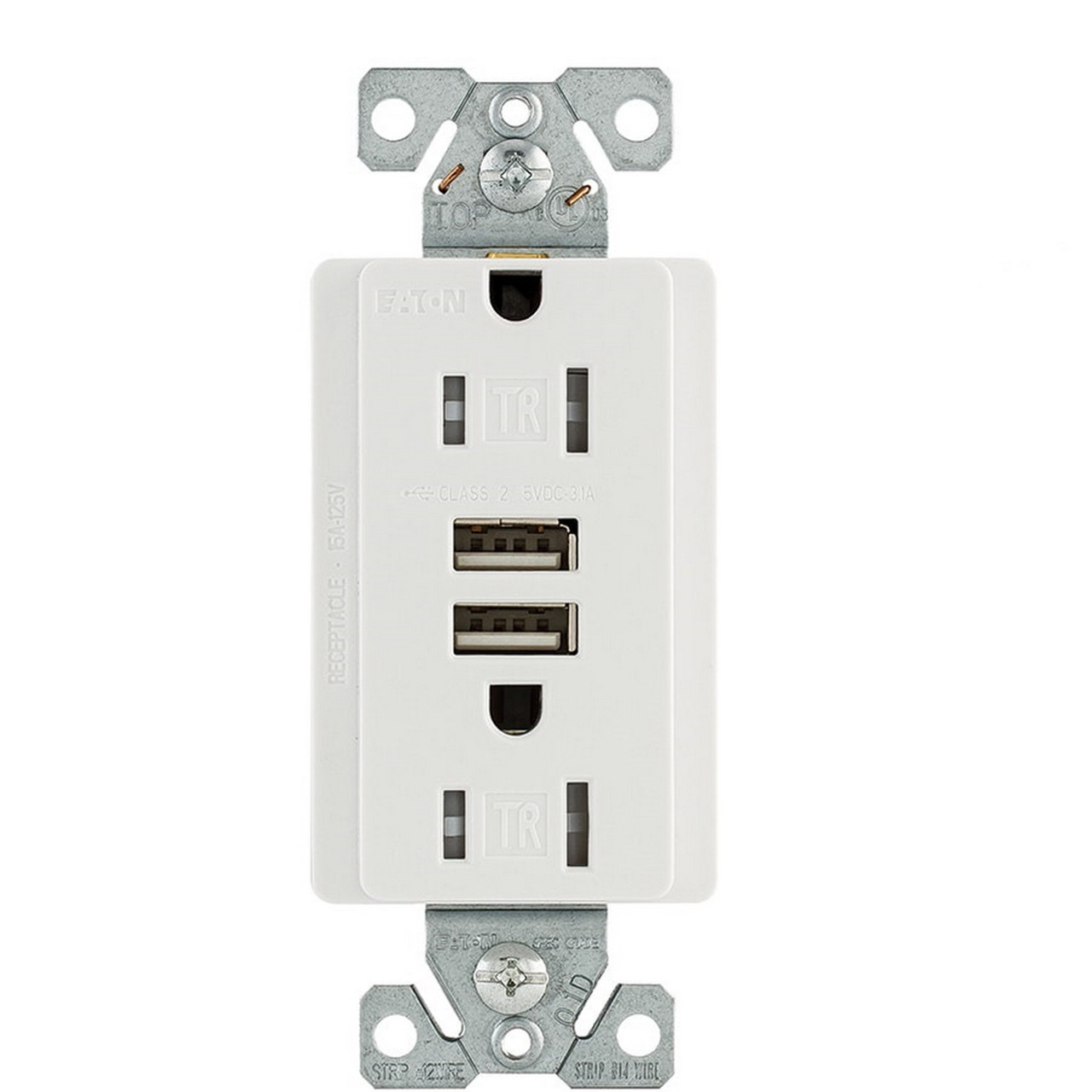 - Eaton White Tamper Resistant 15A Outlet Receptacle 3.1A USB Charger TR7755W