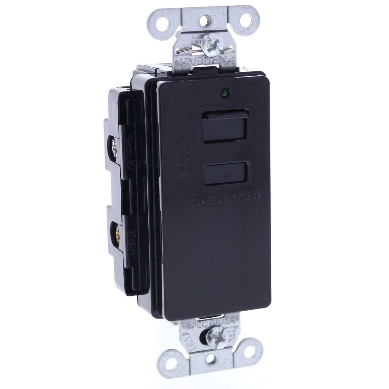 Hubbell USB2BK black charger outlet with 2 USB ports. Residential grade, 2-pole, 3-wire, grounding, back (clamp) and side wired. Features include: