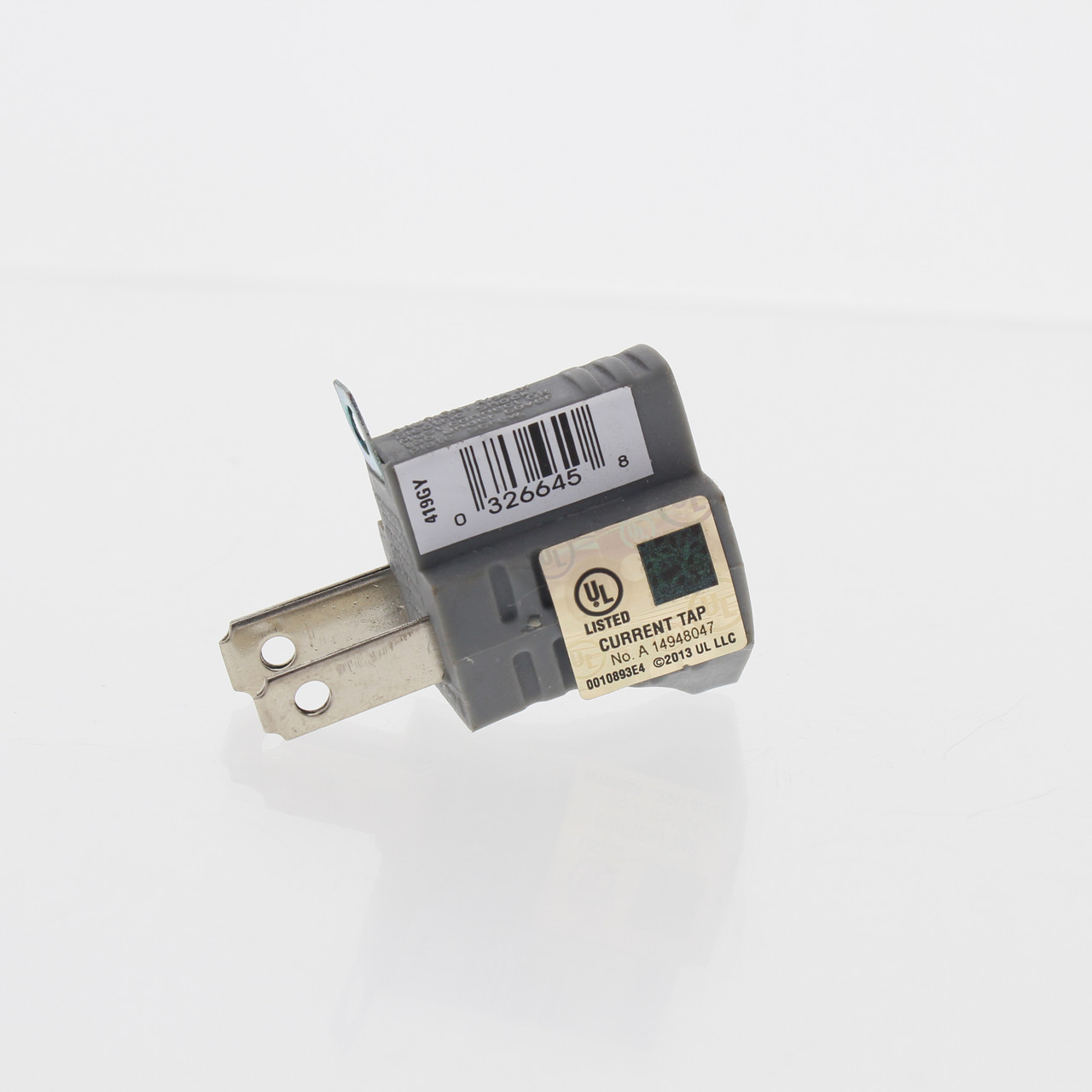 Cooper #419 gray single outlet adapter. The Cooper plug is rated at 15 amps and 125 volts. Grounding adapter with grounding lug converts 2-pole polarized outlet to 3-wire grounding outlet. Grounding lug fastens to wall plate mounting screw for excellent ground connection. Safety tab extends face on adapter to assure grounding plugs can not be plugged in incorrectly. Polypropylene body resists dirt and marring. Ribbed body for sure insertion and removal. Solid brass blades for long life and low heat rise at full load. Bulk packed loose with no individual packaging. Features include: