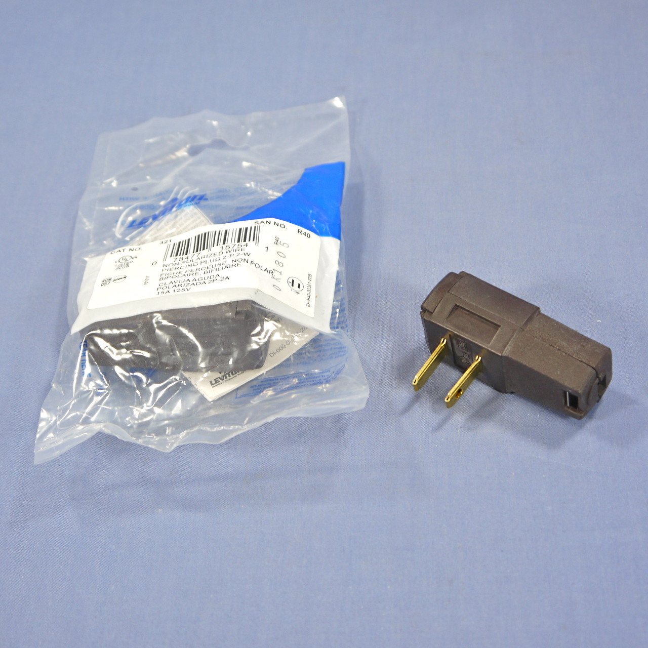 2 Leviton 321 brown easy-wire straight blade plugs. Right angle design with side cord entry keeps cord close to the wall and directs the cord sideways from the outlet (instead of up or down). Easy wire design makes for fast hookup. Residential Grade, NEMA 1-15P, non-grounding, rated 15A 125V. Plug blades are Non-polarized; do not use in an application which requires a polarized plug. Wire rating: