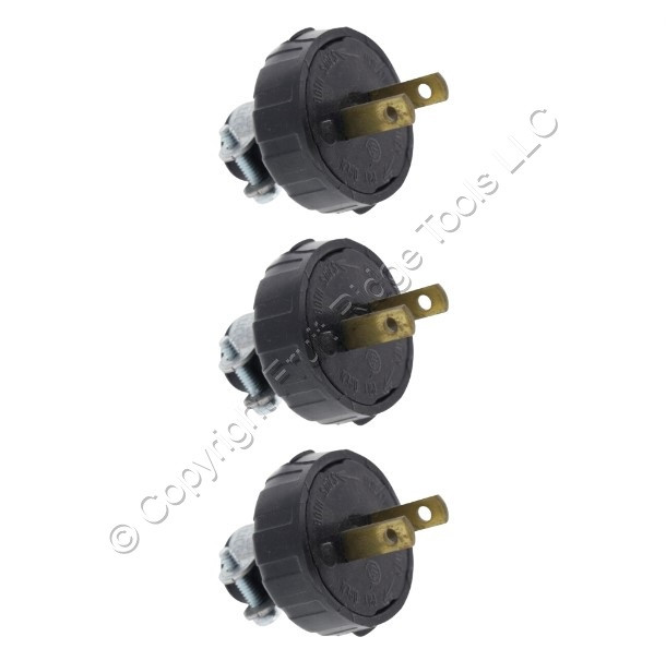 3 Leviton 48646 black straight blade round plugs. Residential Grade, NEMA 1-15P, 2-pole, 2-wire, non-polarized, rated 15 A 125V. Bulk packed loose with no individual packaging. Features include: