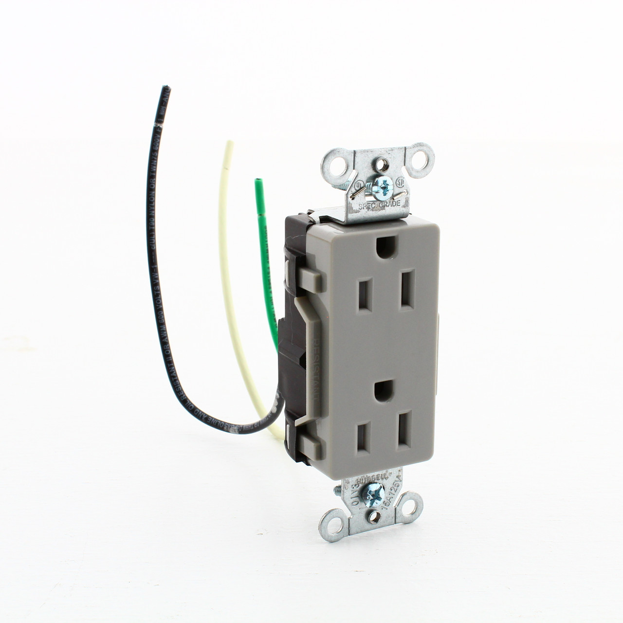 Hubbell DR15GRYTRP2 gray tamper resistant pre-wired decorator receptacle outlet. Commercial Specification Grade, NEMA 5-15R, 2-pole, 3-wire, smooth nylon face, self-grounding, 6.5" stranded wire leads (12 AWG), rated 15A 125V. Bulk packed loose with no individual packaging. Features include: