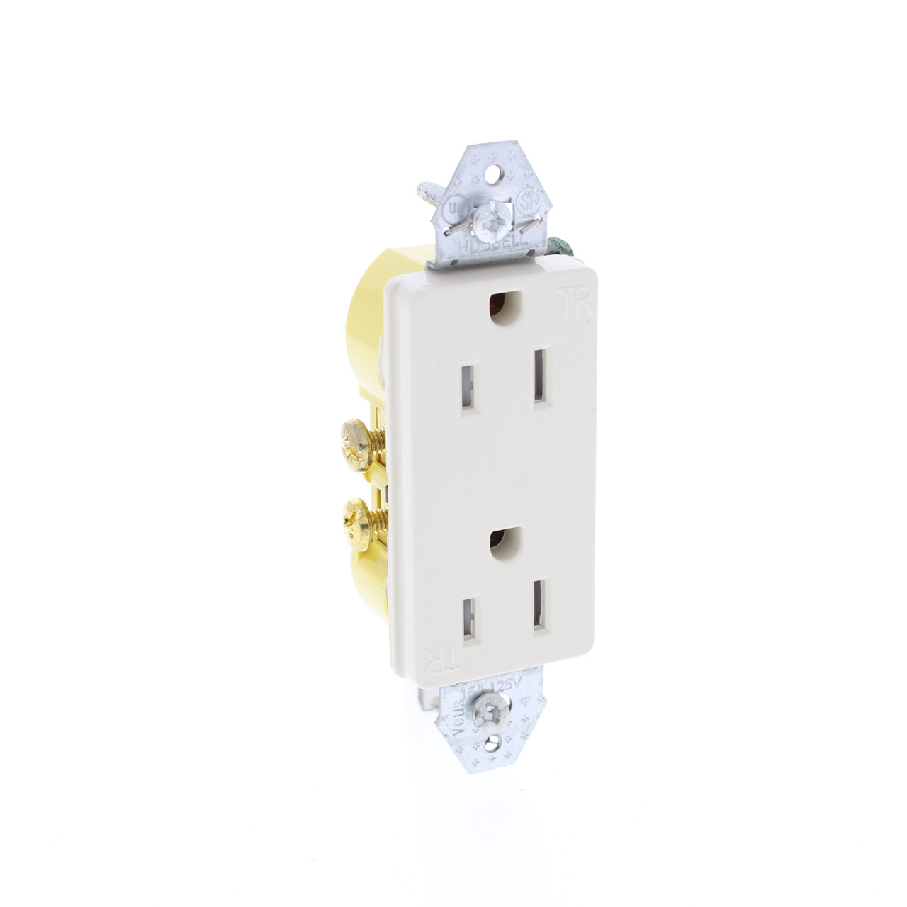 Hubbell tradeSELECT RRD15KLATR light almond tamper resistant decorator duplex receptacle. Special earless design for special applications like surface mount boxes, recessed metal boxes, and panel installations. Residential Grade, NEMA 5-15R, 2-pole, 3-wire, grounding, push-in and side wired, rated 15A 125V. Each is individually packaged. Features include: