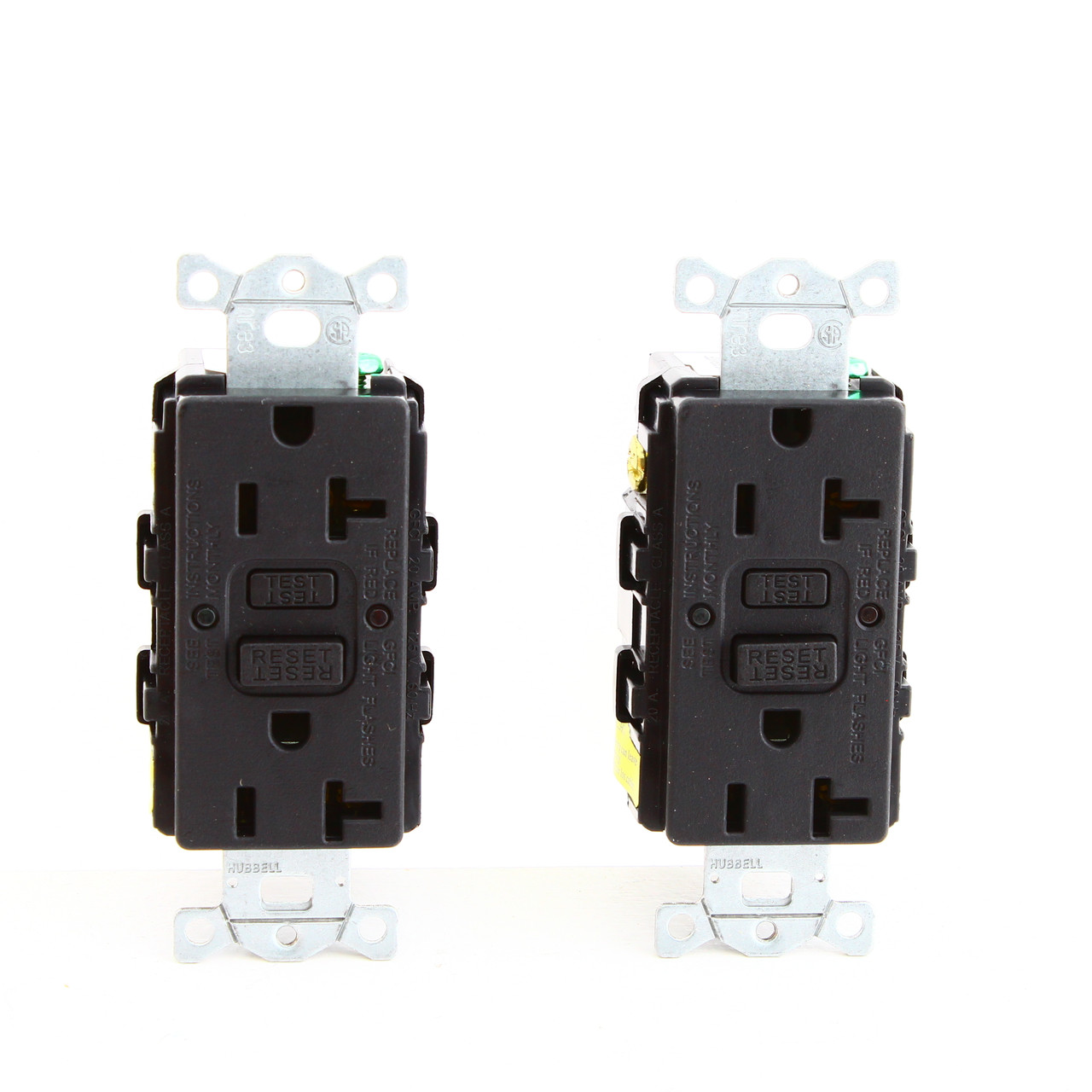 2-Pack of Hubbell GFRST20BKCF black GFCI decorator receptacles. Please note: this GFCI outlet does not come with mounting screws. Heavy Duty Grade, NEMA 5-20R, back and side wired, rated 20A-125V at receptacle and 20A-125V feed-through. Bulk packed loose with no individual packaging or mounting screws. Features include: