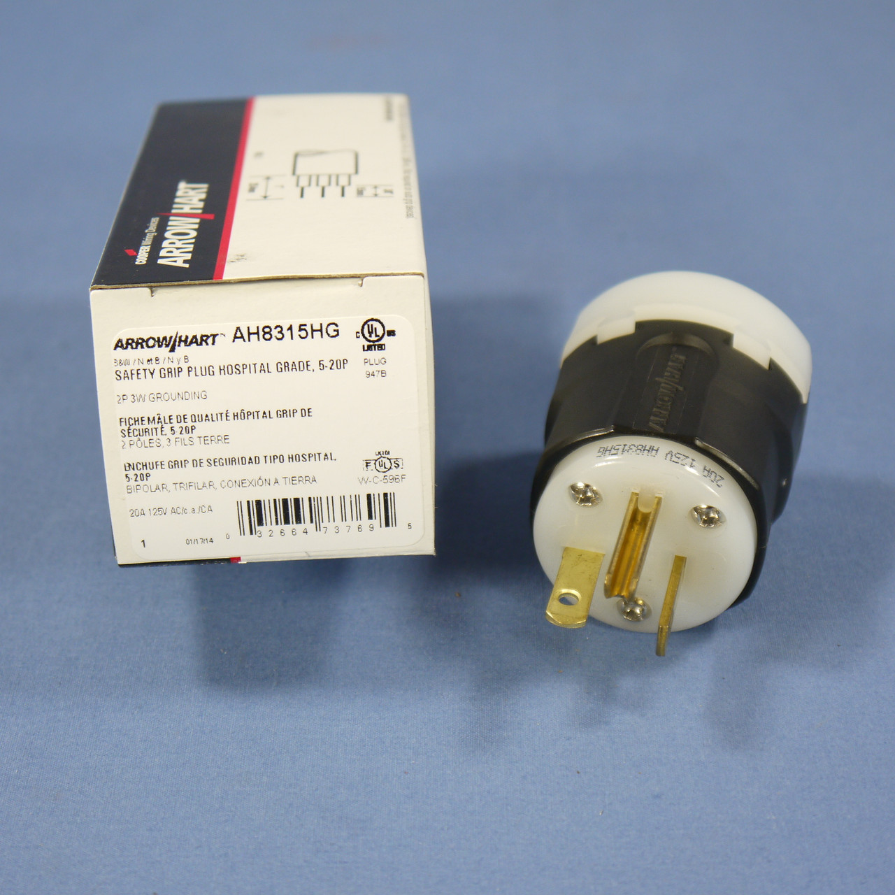 Cooper Arrow Hart AH8315HG Ultra Grip straight blade plug. Built with a contemporary flare and oval ergonomic design for a comfortable yet secure feel, ultra grip plug and connectors offer excellent reliability and durability. A dual dovetail design provides superior cord grip retention, and the grommet allows usage across a wide range of cord diameters. Additionally, reversible inserts in the cord grip allow for exceptional clamp force on large diameter cords. Hospital Grade, NEMA 5-20P, 2-pole, 3-wire, grounding, rated 20A 125V. Hospital Grade devices are top of the line in their category, designed for the high-abuse environments typically found in healthcare, commercial and industrial facilities. Each is individually packaged; packaging may differ from photo. Features include: