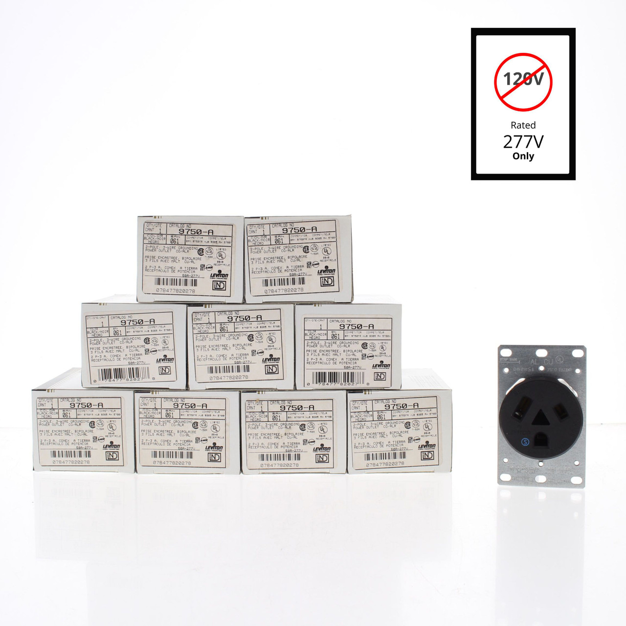 10 Leviton 9750 straight blade power outlets. Industrial Specification Grade, NEMA 7-50R, 2-pole, 3-wire, grounding, rated 50A 277V. Fits wallplates with 2.147" or 2.15" diameter opening. Each is individually packaged; packaging may differ from photo. Features include: