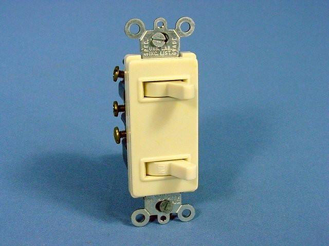 Leviton 5641-I ivory Decora duplex toggle switch. Great for applications where you want to add an additional switch to an existing wall box. Each has 2 switches: one is 3-way; the other is single pole. Commercial Specification Grade, non-grounding, side wired, rated 15A 120/227V AC. Each is individually packaged. Features include: