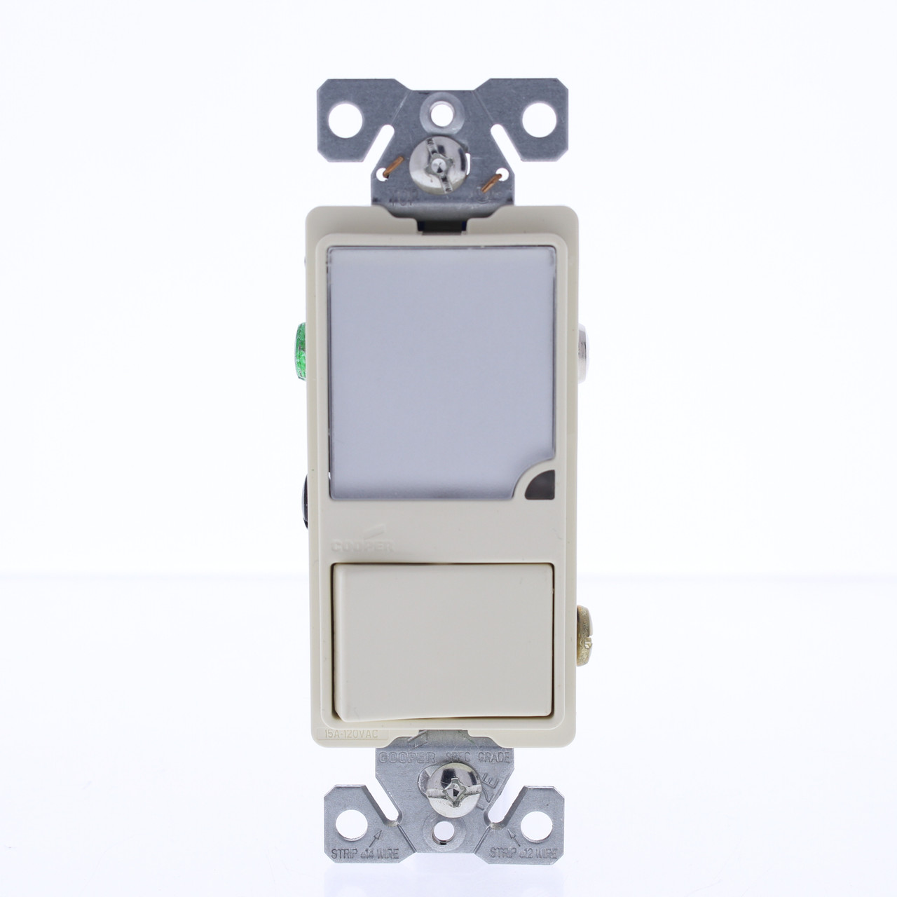 Eaton 7738A-K-L almond single pole rocker switch with LED nightlight (Cooper Wiring Devices is a division of Eaton). Commercial grade switch, single pole, back and side wired (#14-12 AWG), grounding, rated 15A 120V/AC. Dimmable 1 Watt LED nightlight is ideal for bathrooms, hallways, stairs and landings. The flush-mount LED nightlight provides added safety and comfort along with receptacle functionality. Each is individually packaged; packaging may differ from photos. Features include: