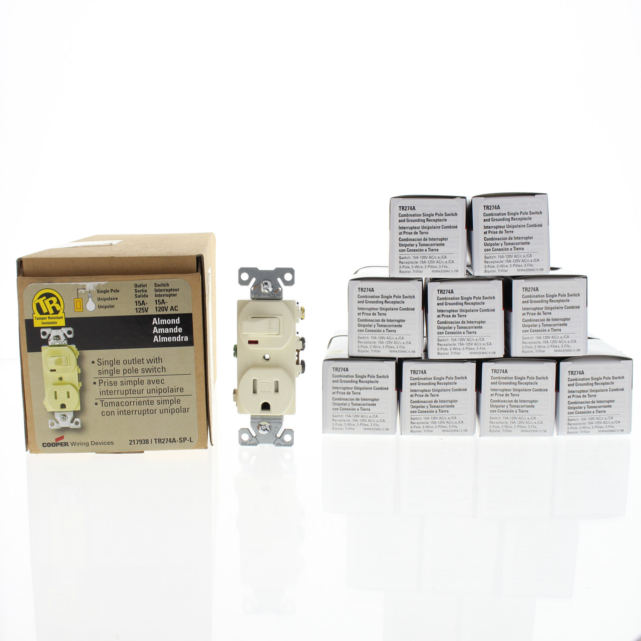 10 Cooper TR274A almond tamper resistant combination switch/receptacles. Great for applications where you want to add a switch or outlet to an existing box. Each is individually packaged; packaging may differ from photo. Features include: