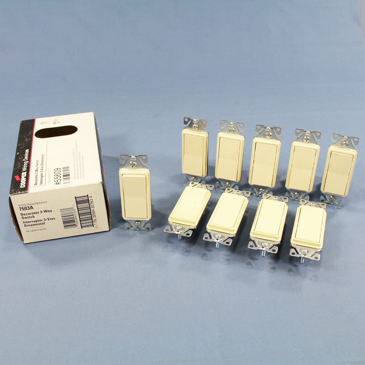 10 Cooper 7503A almond Decorator rocker switches. They are Residential Grade, 3-way, grounding, Speedwire push-in, back and side wired, 15A 120/277VAC. Features include:
