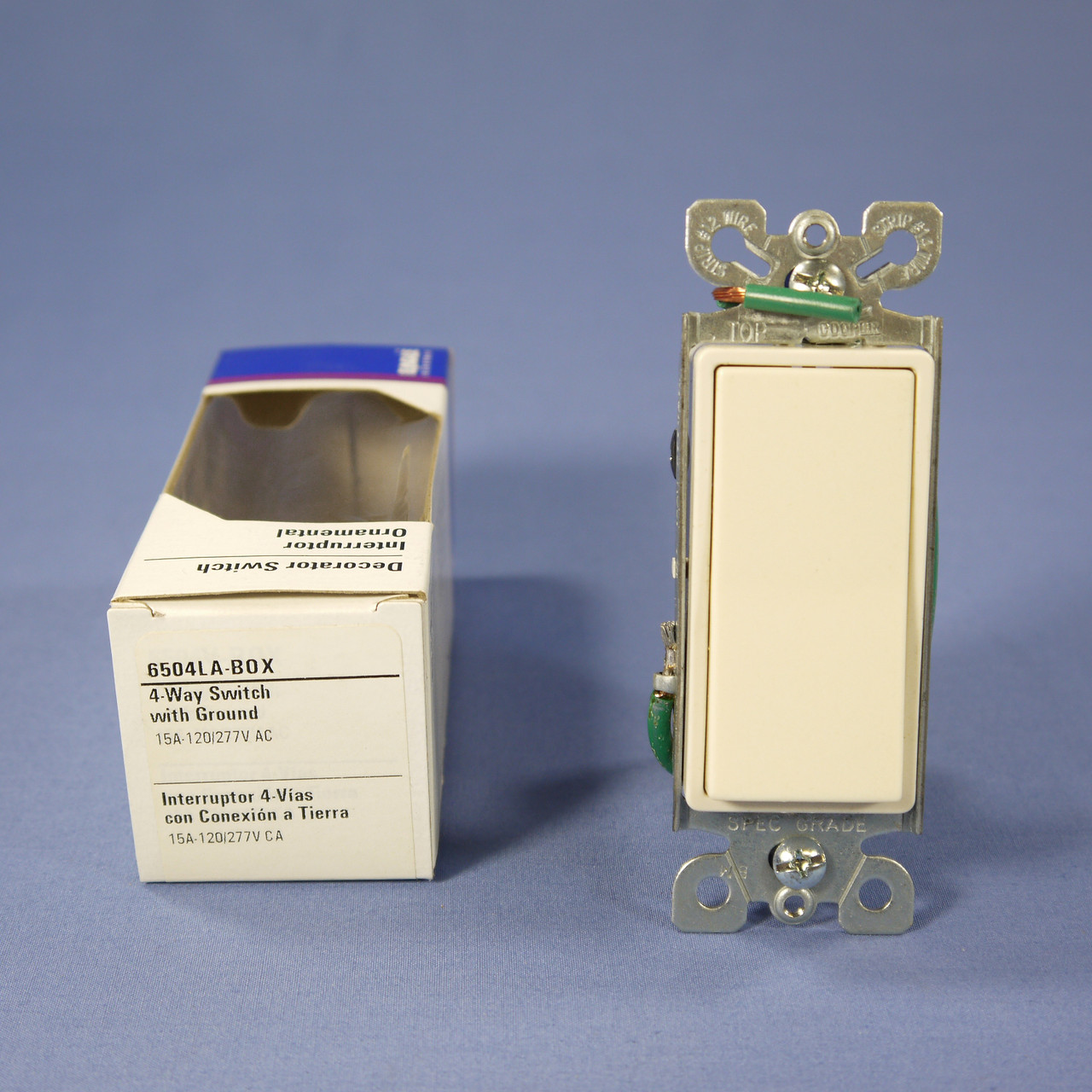 Eagle Electric 6504LA light almond Decorator rocker switch; Eagle is a division of Cooper Wiring Devices. Specification Grade, 4-WAY, side wired, grounding, rated 15A 120/277VAC. Each is individually packaged; packaging may differ from photo. Features include: