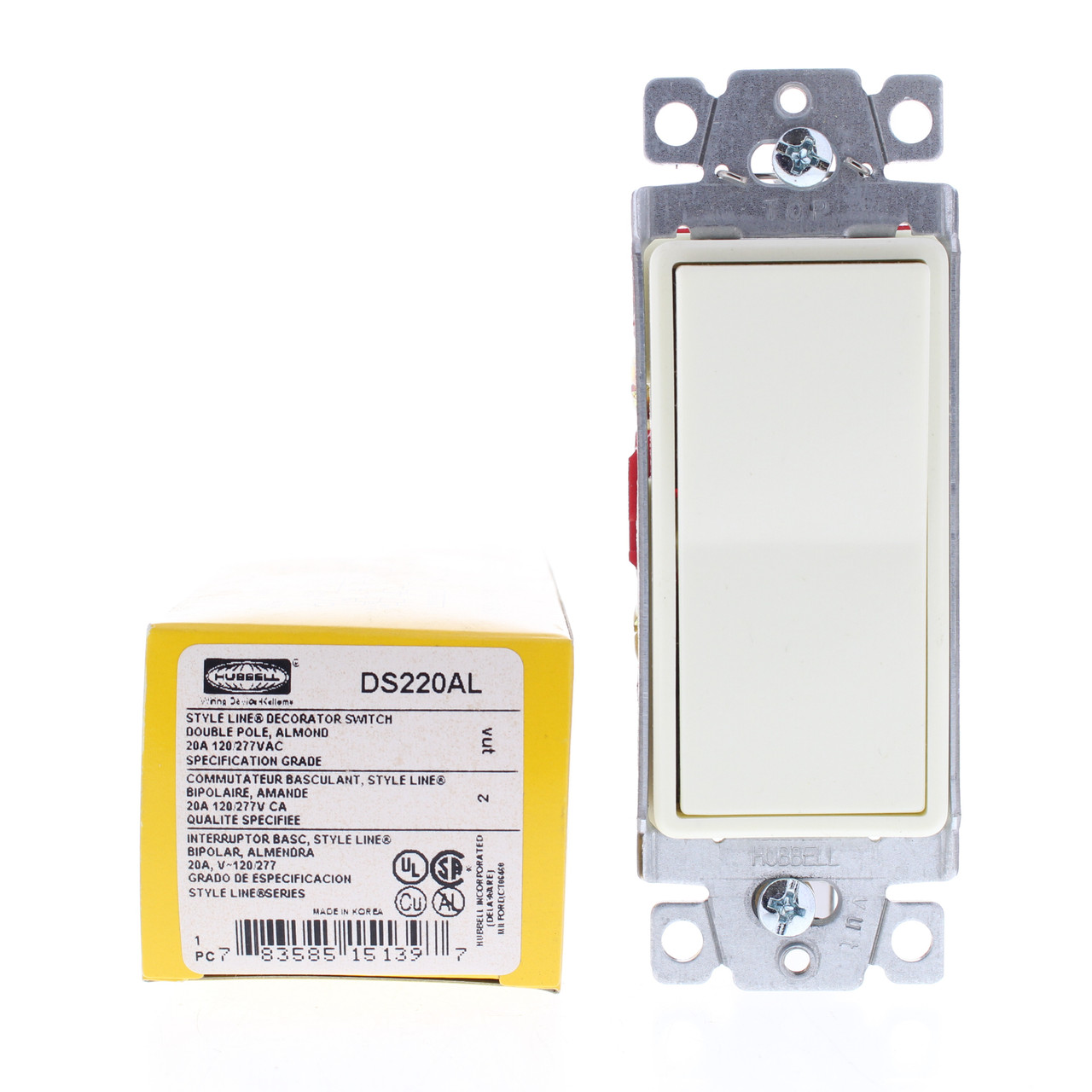Hubbell DS220AL almond decorator rocker switch. Specification Grade, double pole, grounding, back and side wired, 20A 120/277VAC. Each is individually packaged with instructions. Packaging may differ from photo. Features include: