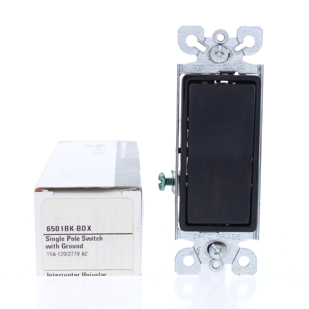 Cooper Electric 6501BK black decorator rocker switch. Specification Grade, single pole, push-in and side wired, grounding, rated 15A 120/277VAC. Each is Individually packed; these have been stored and moved around in a warehouse, as a result some may have minor dings. ITEM PICTURED IS FOR REFERENCE ONLY: SCRATCHES, SCUFFS, DINGS, and BLEMISHES WILL VARY FOR EACH INDIVIDUAL ITEM. Features include: