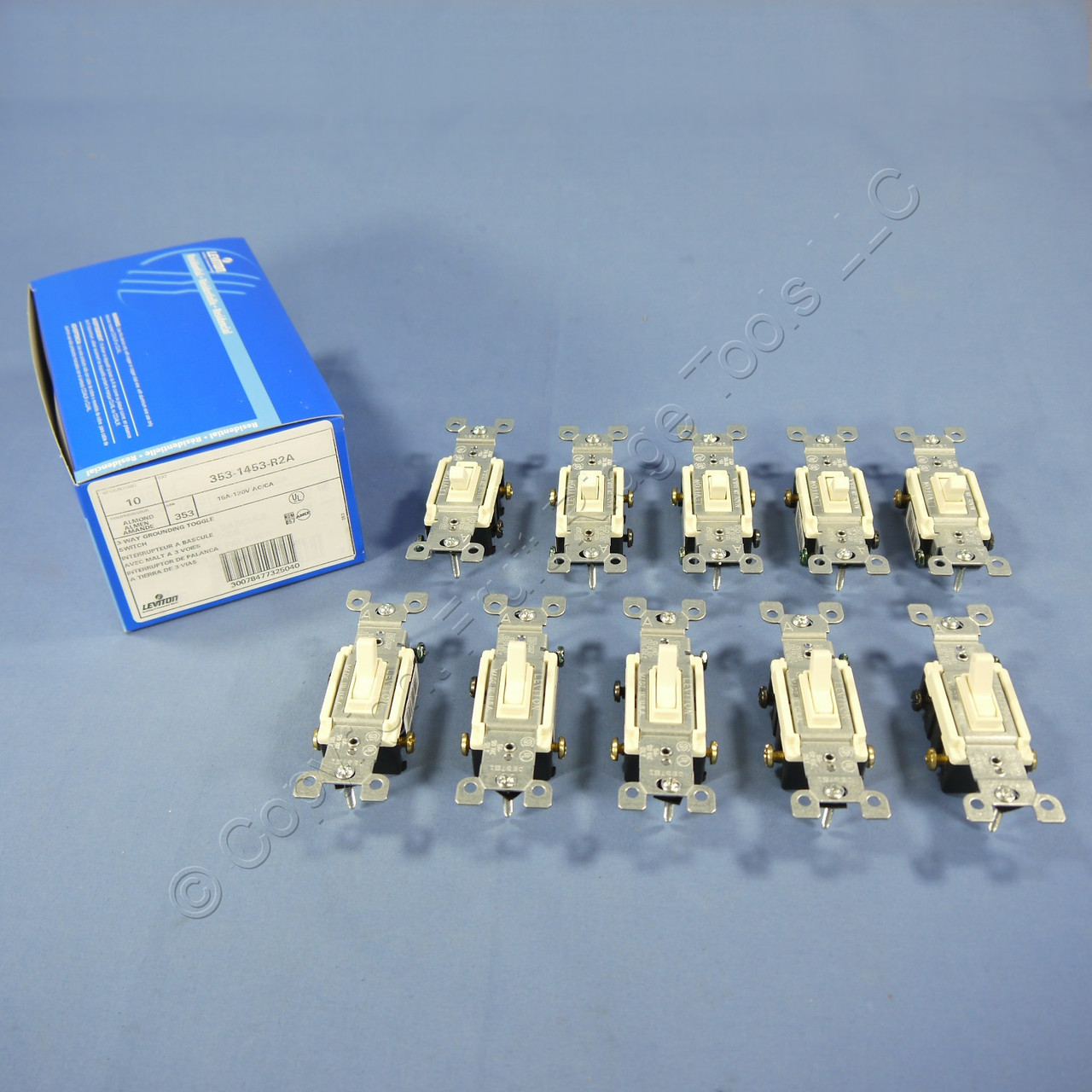 10 Leviton 1453-R2A almond 3-way toggle switches. Residential grade, Quickwire and side wired, grounding, rated 15A 120VAC. Bulk packed in carton. Features include: