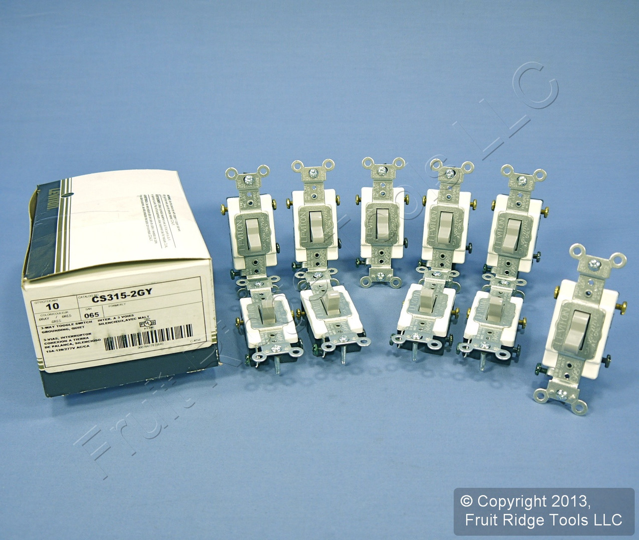 10 Leviton CS315-2GY gray toggle switches. Commercial Specification Grade, 3-way, side-wired, grounding, rated 15A 120/277V AC. This is a heavy duty commercial switch; don't confuse it with lighter duty residential models when comparing prices. Each is individually packaged. Features include: