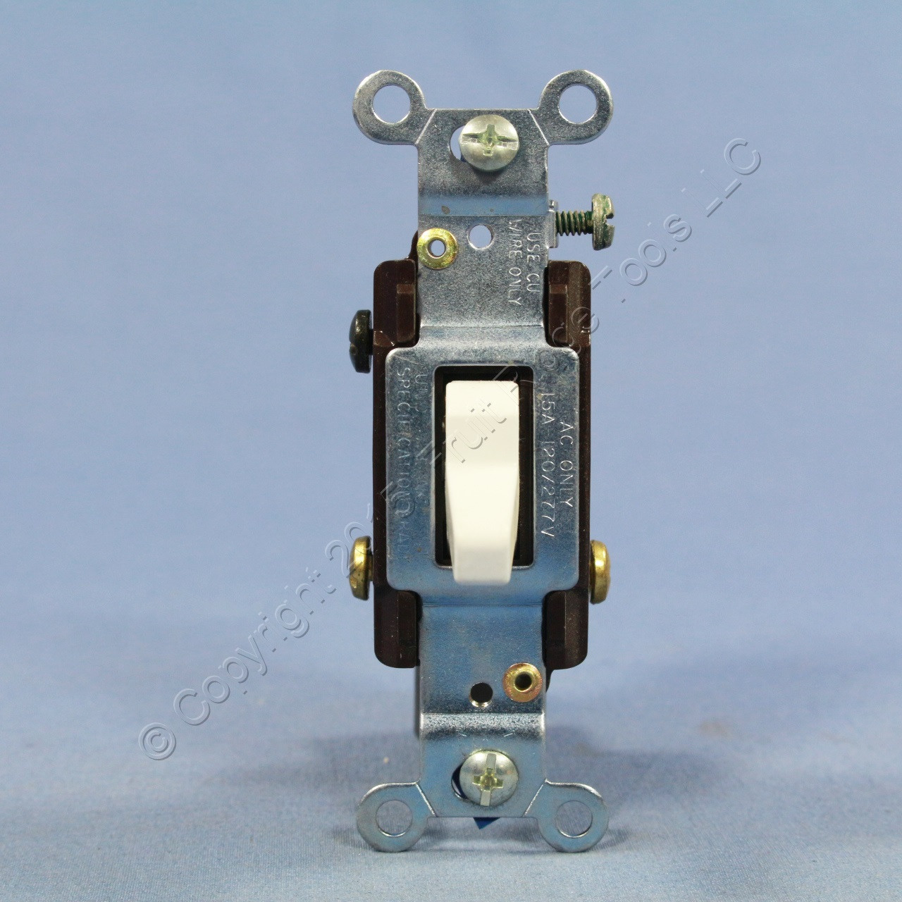 Cooper Wiring Devices CS315W white commercial 3-way toggle switch. Commercial Specification Grade, 3-way, grounding, side wired, rated 15A 120/277VAC. Bulk packed loose with no individual packaging or instructions. Features include:
