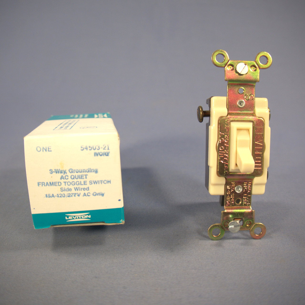 Leviton 54503-I ivory toggle switch. Toggle is framed for a neat finished appearance once the wallplate is installed. Commercial Specification Grade, 3-way, side-wired, non-grounding, rated 15A 120/277V AC. This is a heavy duty commercial switch; don't confuse it with regular residential models when comparing prices. Designed to offer outstanding reliability and top performance in commercial settings such as: municipal facilities, government buildings, malls, department stores, hospital and health care facilities, office buildings, schools, colleges, universities, houses of worship and cultural institutions (also suitable for residential installations). Each is individually packaged; packaging may differ from photo. Features include: