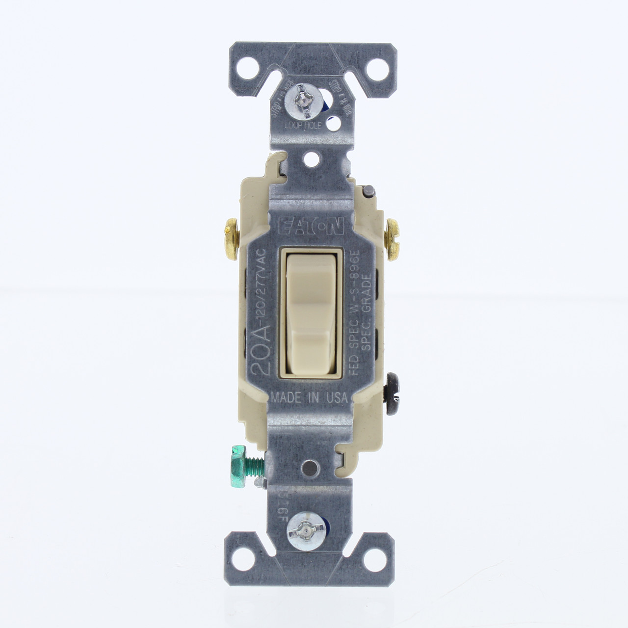 Eaton CS320V ivory commercial 3-way toggle switch. Commercial Specification Grade, 3-way, grounding, side wired, rated 20A 120/277VAC. This is a heavy duty commercial switch; don't confuse it with lighter duty residential models when comparing prices. Bulk packed loose with no individual packaging or instructions as a result some may have minor dinges. Features include: