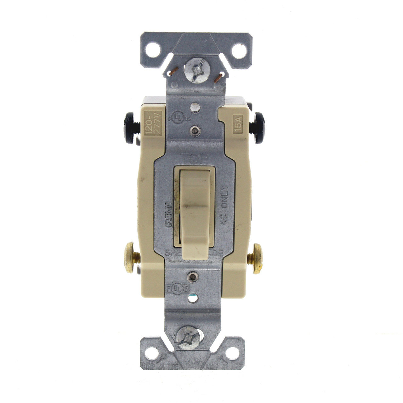 Eaton CS415V ivory commercial quiet toggle switch. Commercial Specification Grade, 4-WAY, grounding, side wired, 15A 120/277VAC. Bulk packed loose with no individual packaging. Features include: