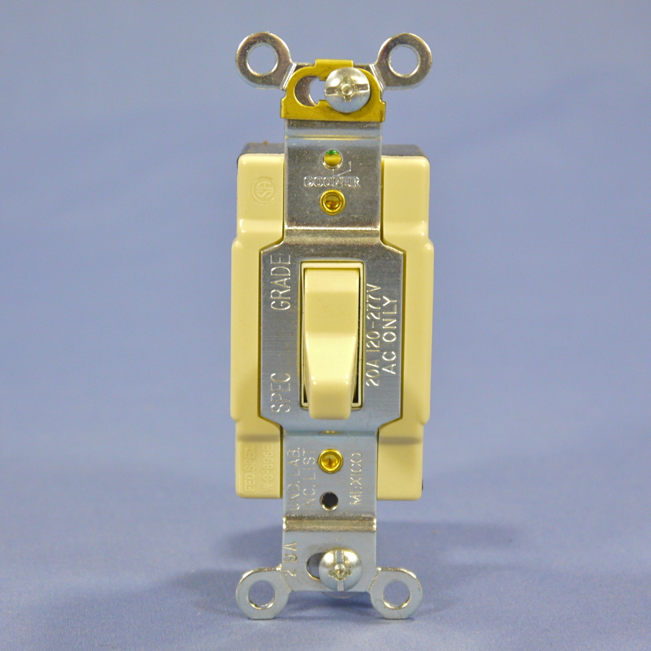Cooper CS420V ivory toggle switch. Commercial Specification Grade, 4-way, grounding, side wired, rated 20A 120/277VAC. Bulk packed loose with no individual packaging. Features include: