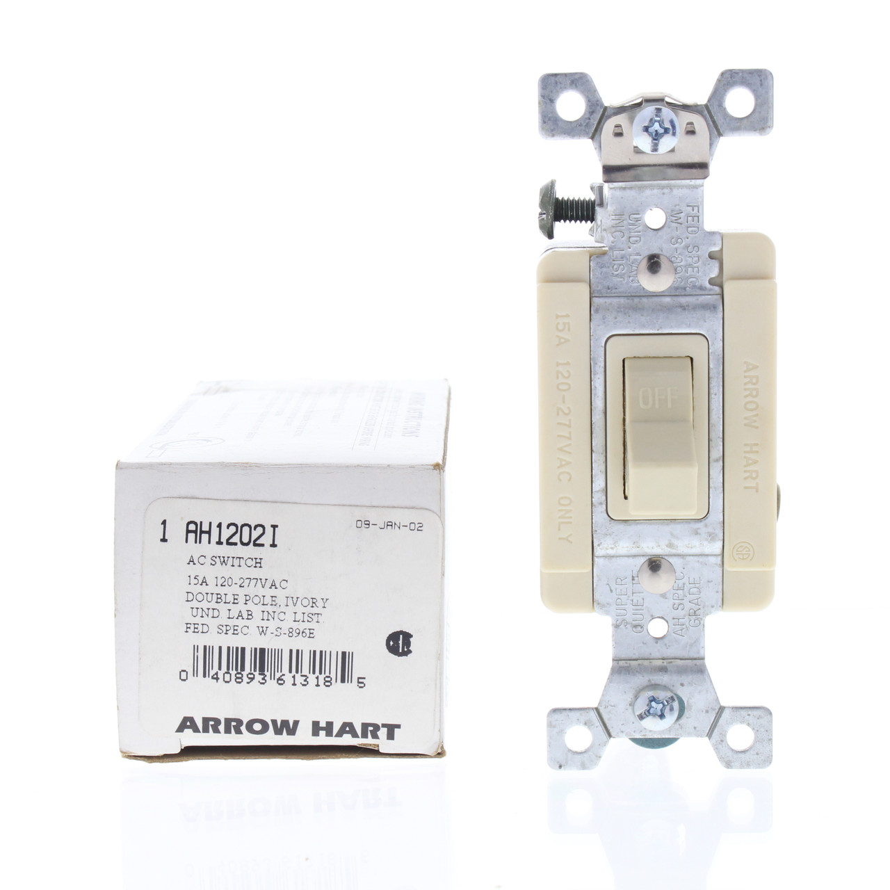 Cooper Wiring Devices AH1202I ivory toggle switch; Arrow Hart/Eagle is a division of Cooper Wiring Devices. Industrial Specification Grade, DOUBLE POLE, back and side wired, grounding, rated 15A 120/277VAC. Each is individually packaged; packaging may differ from photos. Features include: