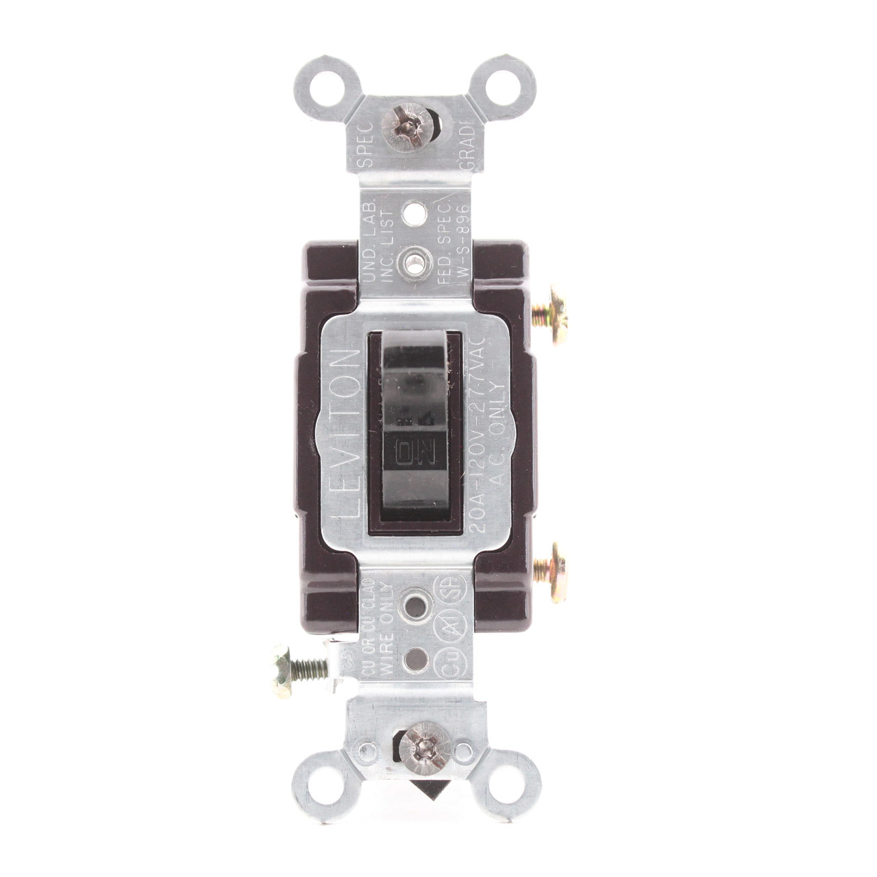 Leviton CS120-2E black toggle switch. Commercial Specification Grade, single-pole, side-wired, grounding, rated 20A 120/277V AC. This is a heavy duty commercial switch; don't confuse it with lighter duty residential models when comparing prices. Bulk packed loose with no individual packaging or instructions. Features include: