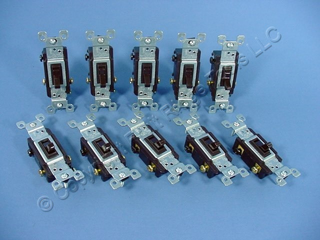 10 Leviton 1453-2 brown 3-way toggle switches. Residential grade, Quickwire and side wired, grounding, rated 15A 120VAC. Bulk packed loose. Features include:
