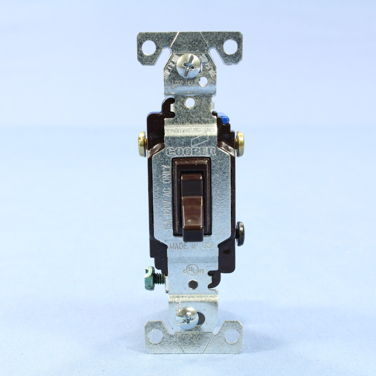 Cooper C1303-7B brown framed toggle switch. Residential Grade, 3-way, grounding, push-in and side wired, rated 15A 120VAC. Each is individually carded; packaging may differ from photo. Features include: