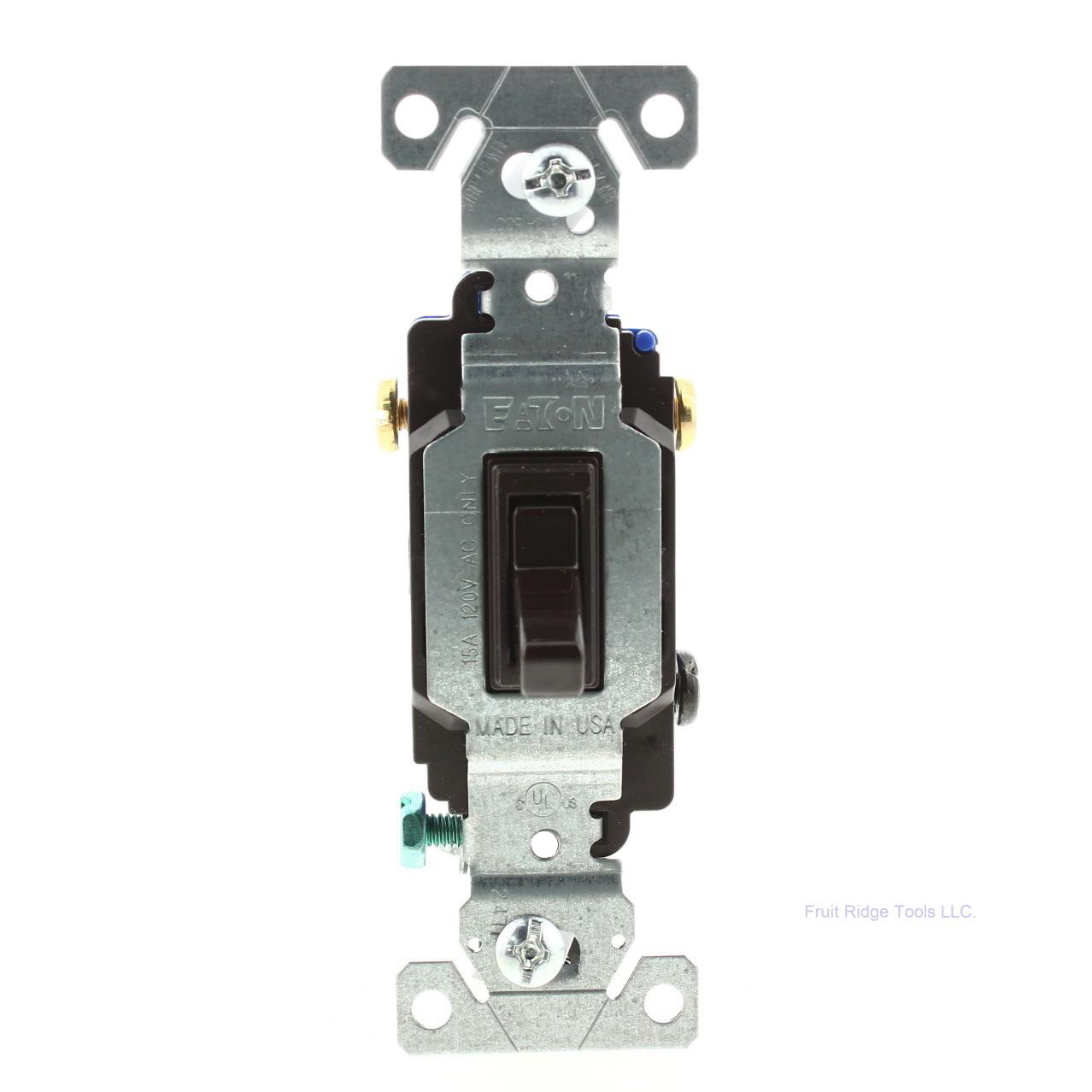 Eaton 1303-7B brown toggle switch. Residential Grade, 3-way, grounding, push-in and side wired, rated 15A 120VAC. Each is individually packaged; packaging may differ from photo. Features include: