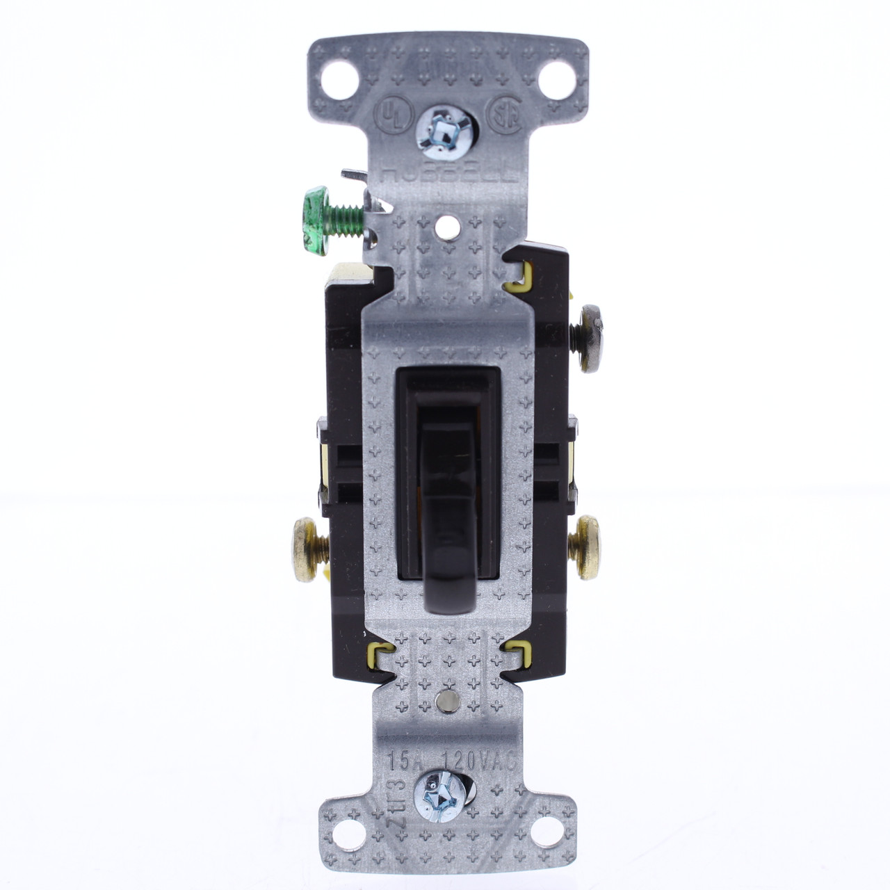 Hubbell RS315Z brown 3-way framed toggle switch. Residential grade, 3-way, push and side wired, grounding, rated 15A 120VAC. Bulk packed loose with no individual packaging or instructions. Features include: