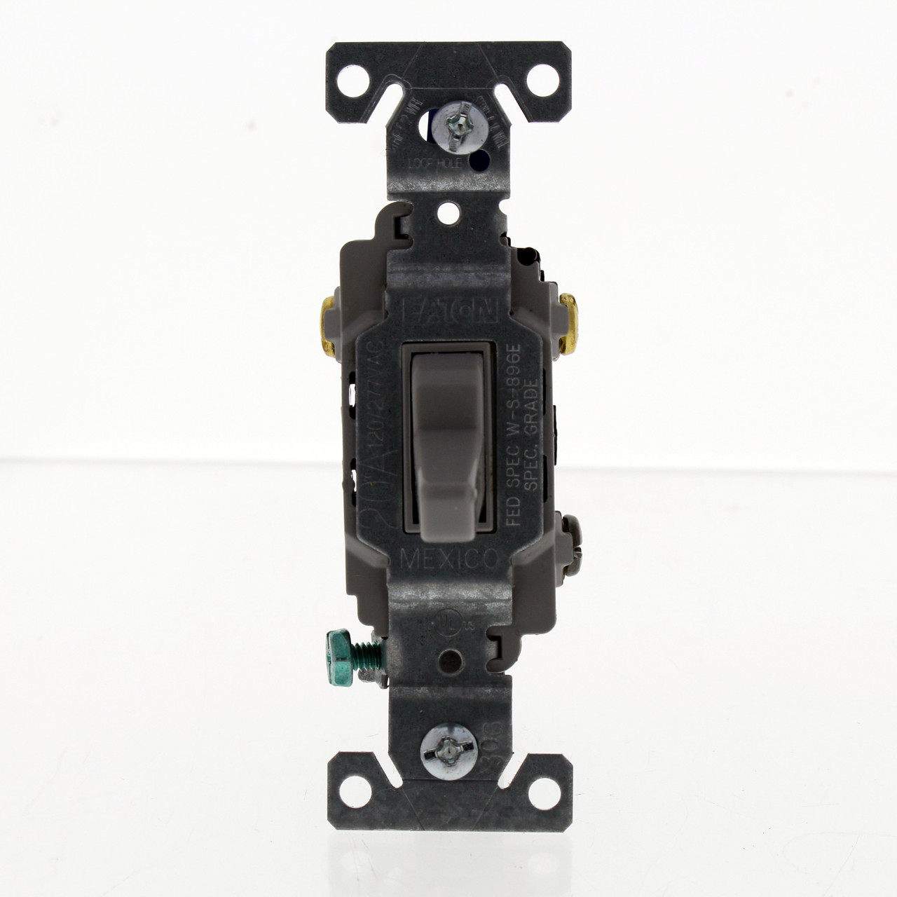 Eaton CSB320GY gray toggle switch. Commercial Specification Grade, 3-way, back and side wired, grounding, rated 20A 120/277V AC. This is a heavy duty commercial switch; don't confuse it with regular residential models when comparing prices. Designed to offer outstanding reliability and top performance in commercial settings such as: municipal facilities, government buildings, malls, department stores, hospital and health care facilities, office buildings, schools, colleges, universities, houses of worship and cultural institutions (also suitable for residential installations). Each is individually packaged; packaging may differ from photo. Features include: