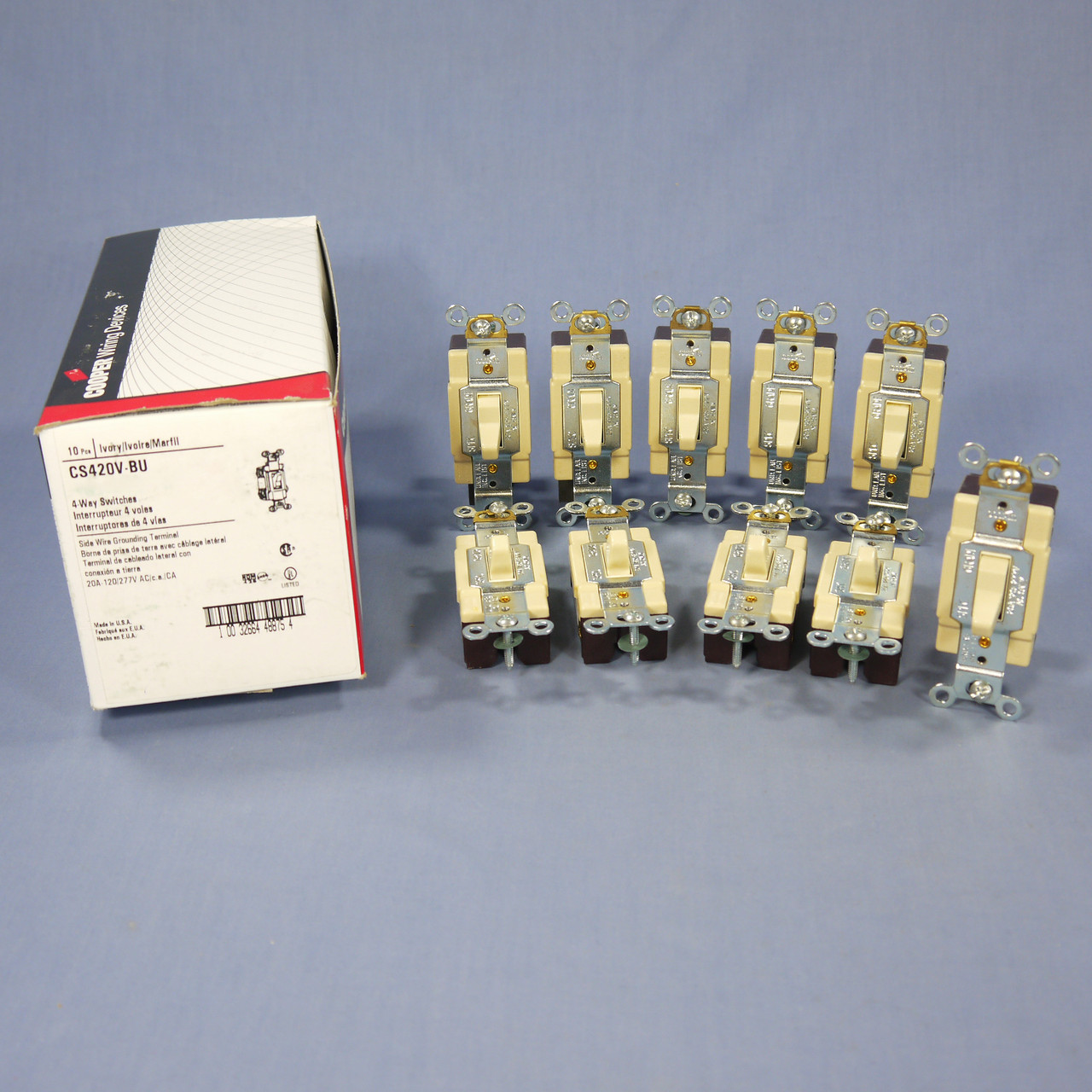 10 Cooper CS420V ivory toggle switches. Commercial Specification Grade, 4-way, grounding, side wired, rated 20A 120/277VAC. Bulk packed loose in carton. Features include: