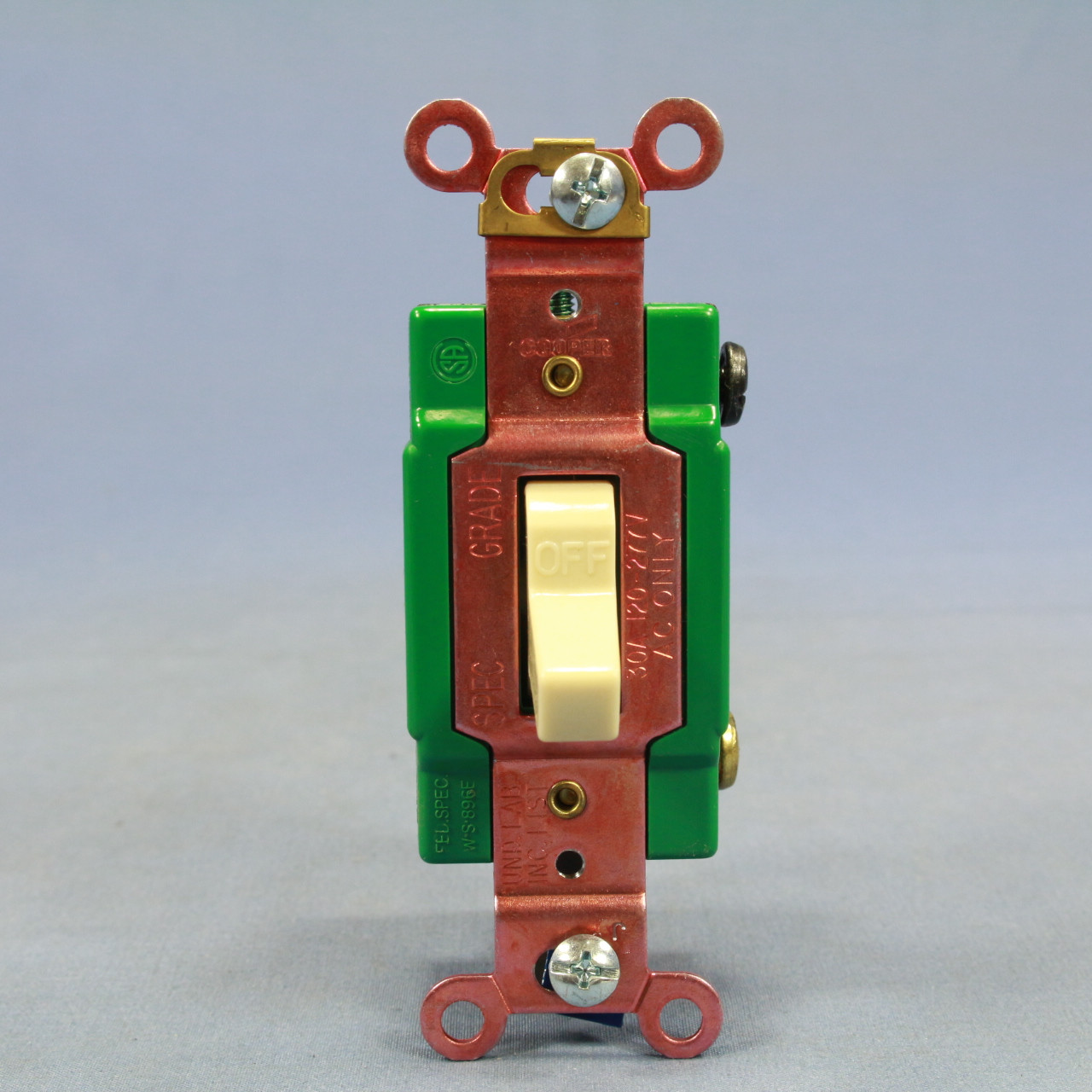 Cooper 3031V ivory toggle switch. Industrial Specification Grade, single-pole, back & side wired, grounding, rated 30A 120V/277V. Each is individually packaged; packaging may differ from photo. Features include:
