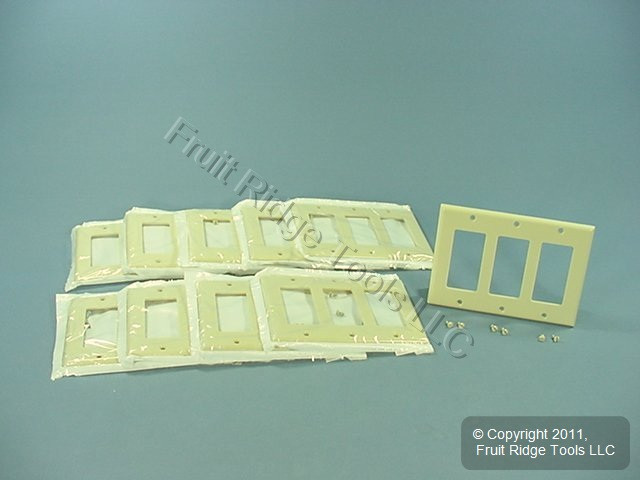 This is a box of 10 Leviton Decora #80411-I ivory, 3-gang Decora wallplates for GFCI and Decora fixtures. They are Residential Grade, standard size plates. Each is individually packaged with matching mounting screws.