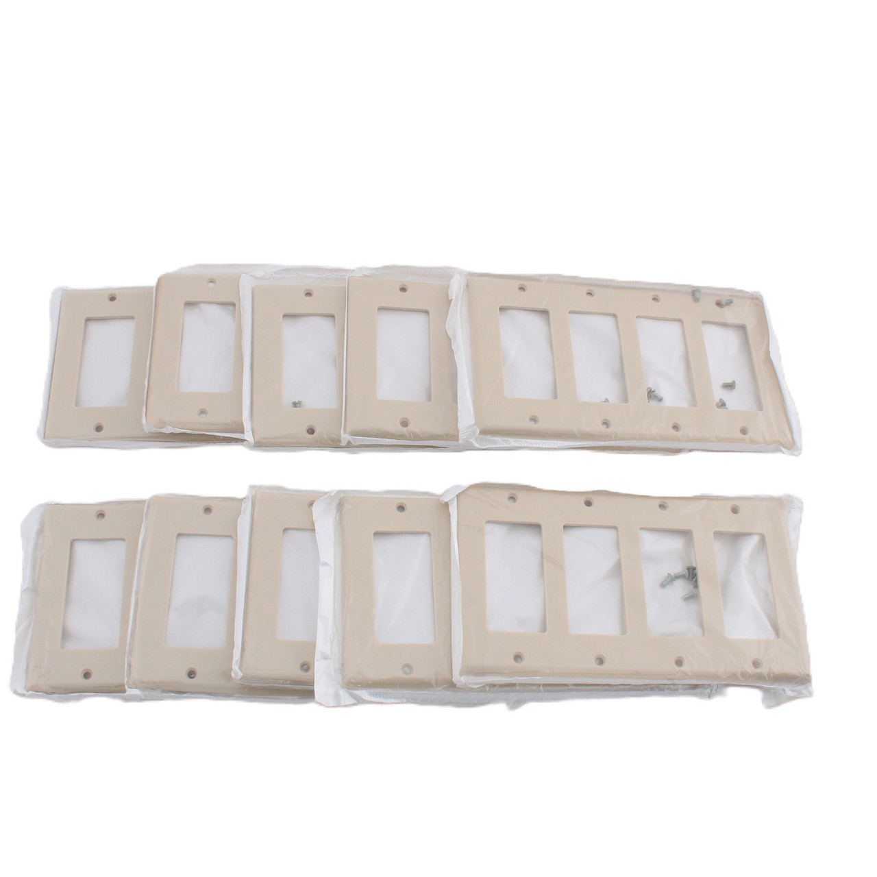 10 Leviton 80412-I Ivory 4-gang Decora wallplates. Residential grade, standard size plate, measuring 4.5"h x 8.19"w with rectangular openings that are compatible with Decora and GFCI devices. Features include: