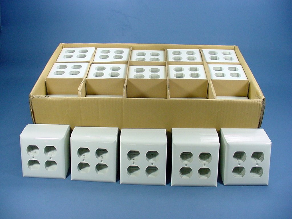 This is a carton of 750 GE #WD-9350894 white receptacle wallplates for 2-gang applications. These are made of tough flexible crack resistant plastic; these bulk packages do not include mounting screws.