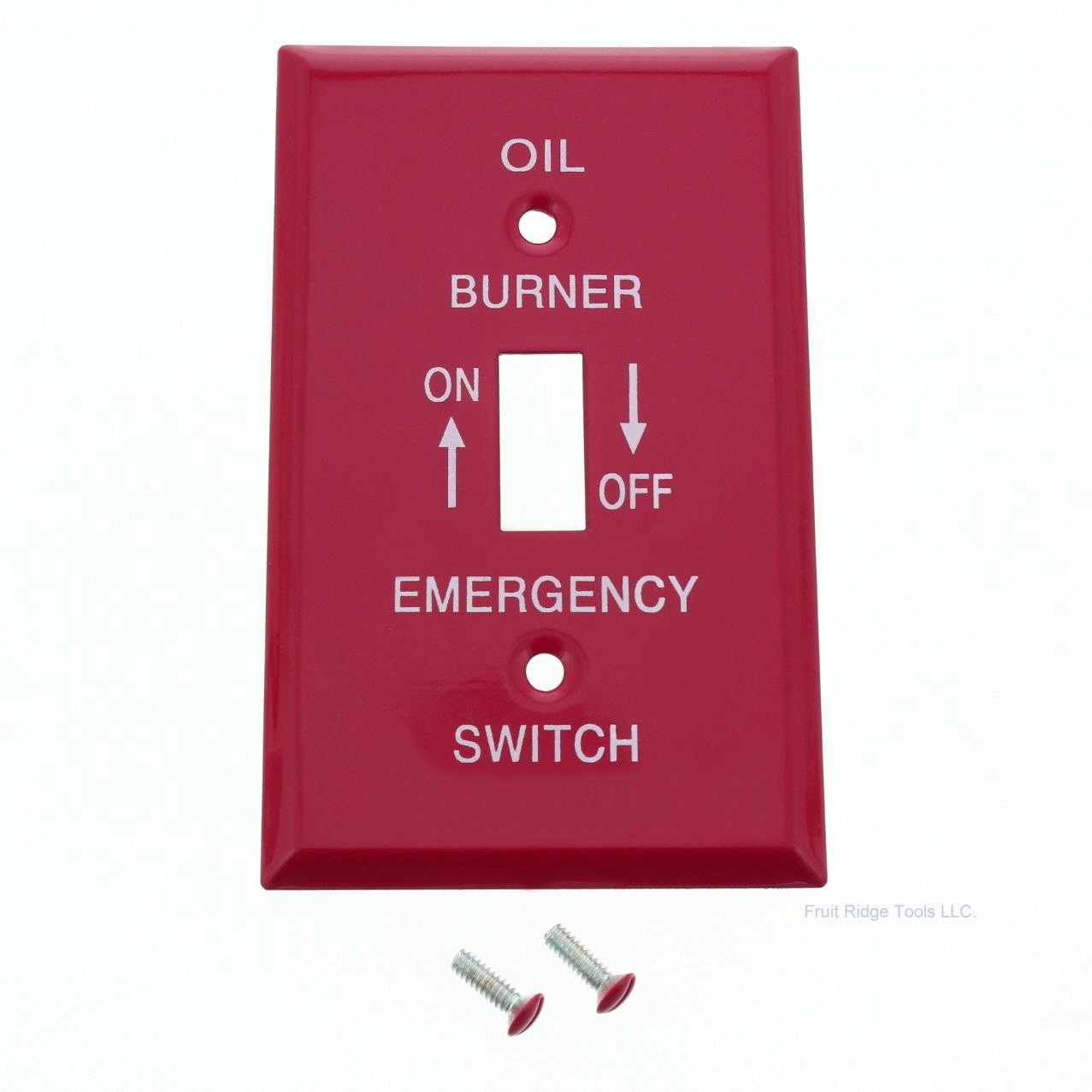 Amerelle C973T red steel toggle switch wallplate, labelled "Oil Burner Emergency Switch" in white lettering. Bold red enamel finish to call attention to your shutoff switch. Standard size plate, measuring 4-1/2"h x 2-3/4"w..