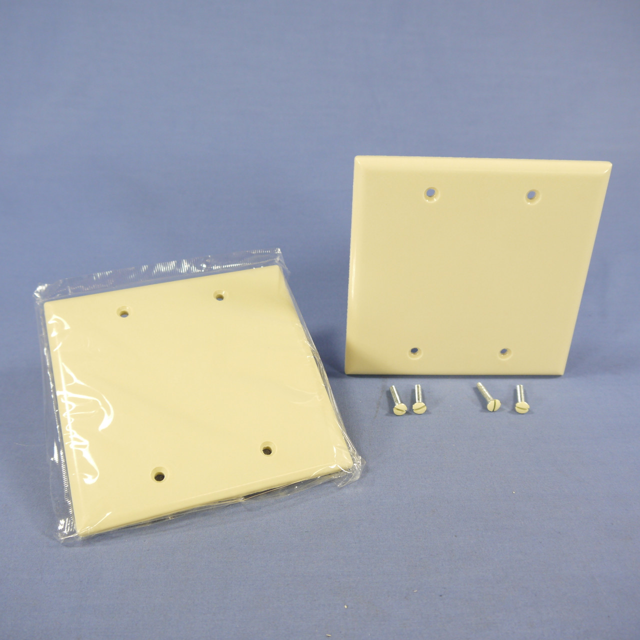 2 Cooper 2137V ivory 2-gang blank thermoset wallplates. Standard Grade, standard size 2-gang plate measuring 4.50"h x 4.563"w. Features include: