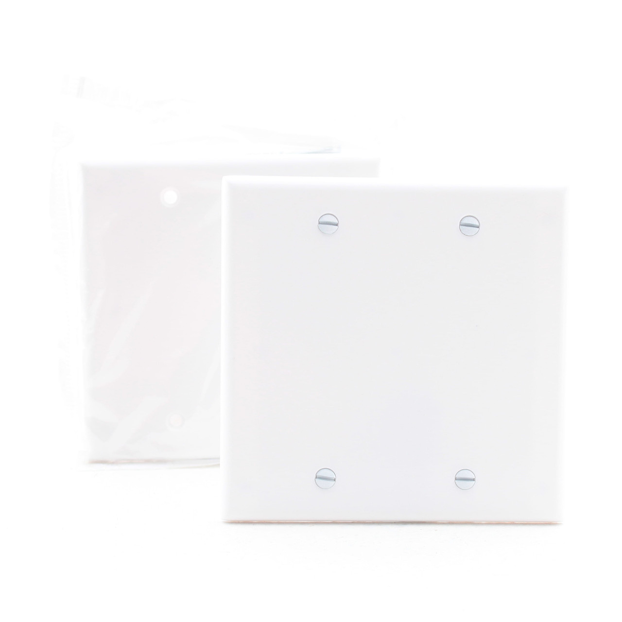 2 Leviton 88025 white 2-gang blank wallplates. Residential Grade, standard size 2-gang plate measuring 4.50"h x 4.56"w. Features include: