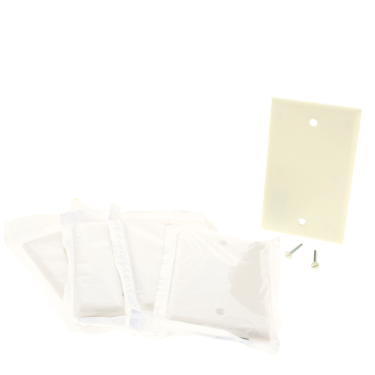 4 Leviton 78014 light almond blank box-mount wallplates. Residential Grade, standard size plate measuring 4.50"h x 2.75"w. Features include: