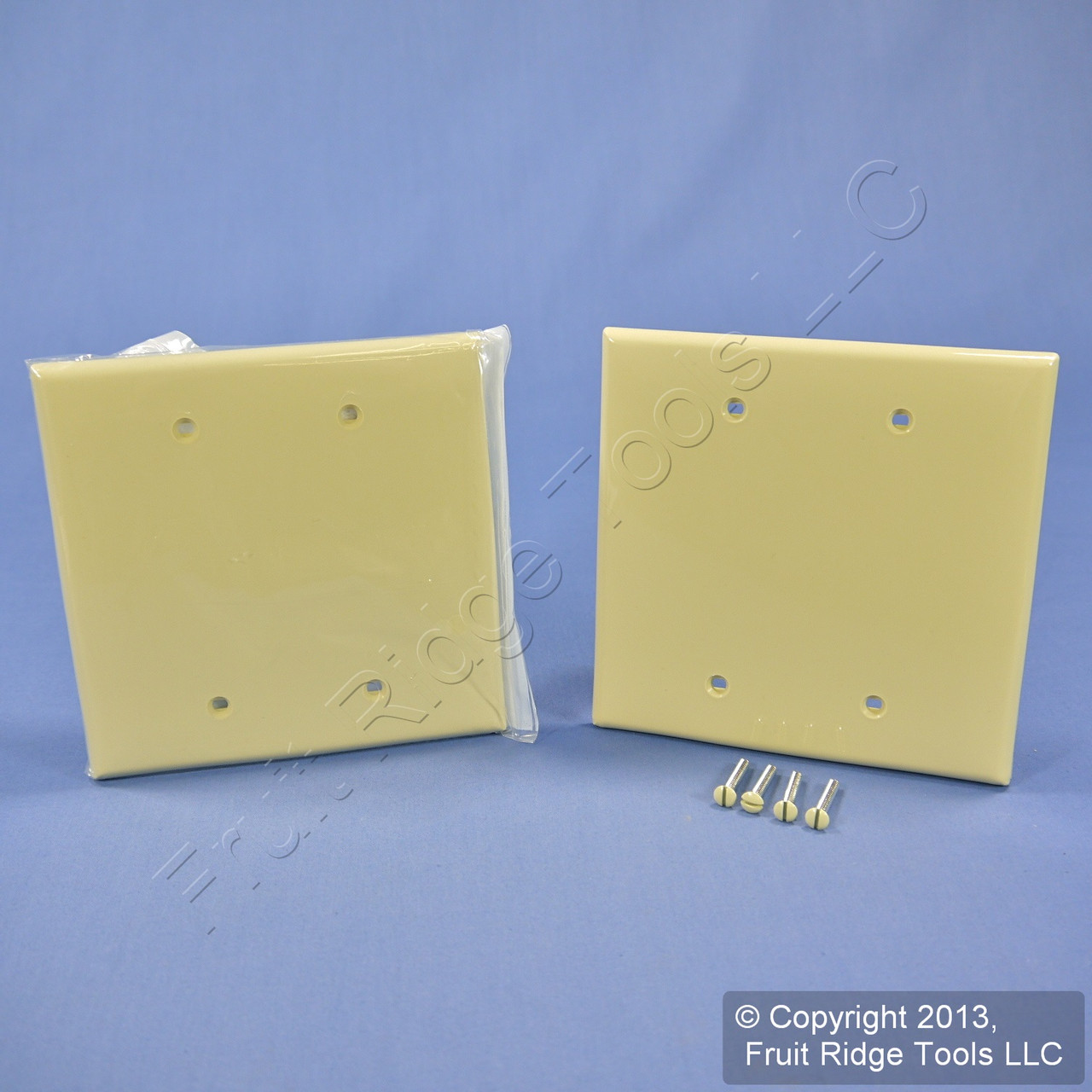 2 Leviton PJ23-I ivory 2-gang blank wallplate covers. Commercial Grade, Midway size, made of a high-performance unbreakable thermoplastic for high abuse environments; do not confuse it with regular residential grade wallplates which can chip and crack. Midway size measures 4.88"h X 4.94"w, 3/8" larger in both dimensions than standard size plates and is intended for use with larger volume outlet boxes or to hide irregularities in the surrounding wall. Features include: