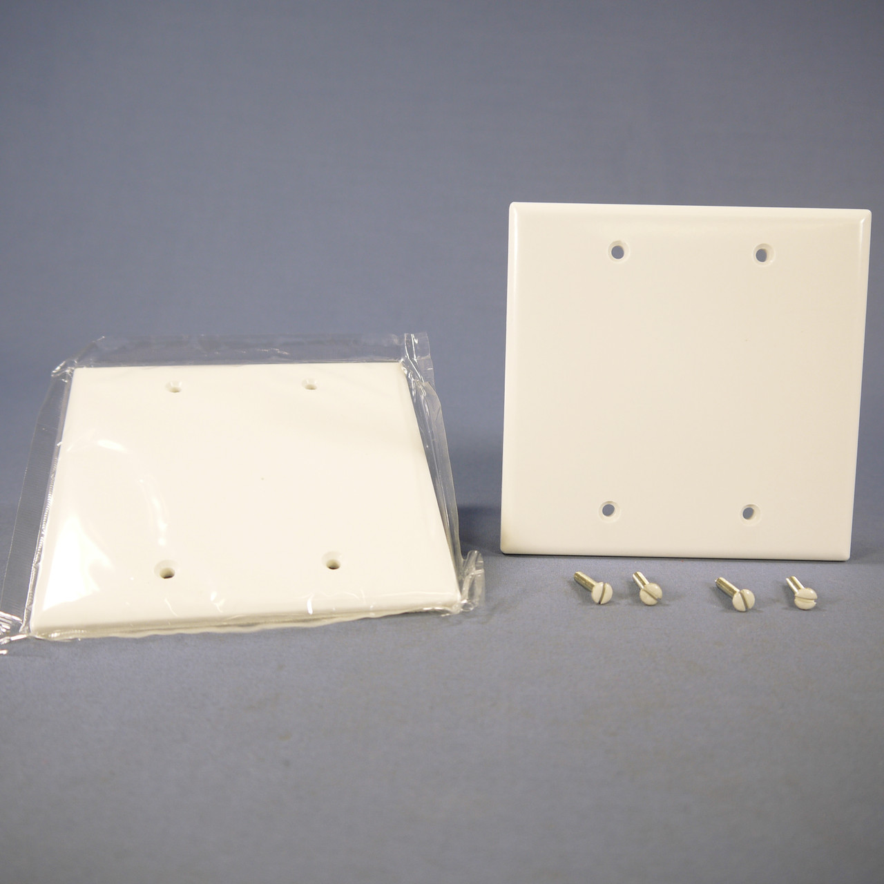 2 Cooper 2137W white 2-gang blank thermoset wallplates. Standard Grade, standard size 2-gang plate measuring 4.50"h x 4.563"w. Features include: