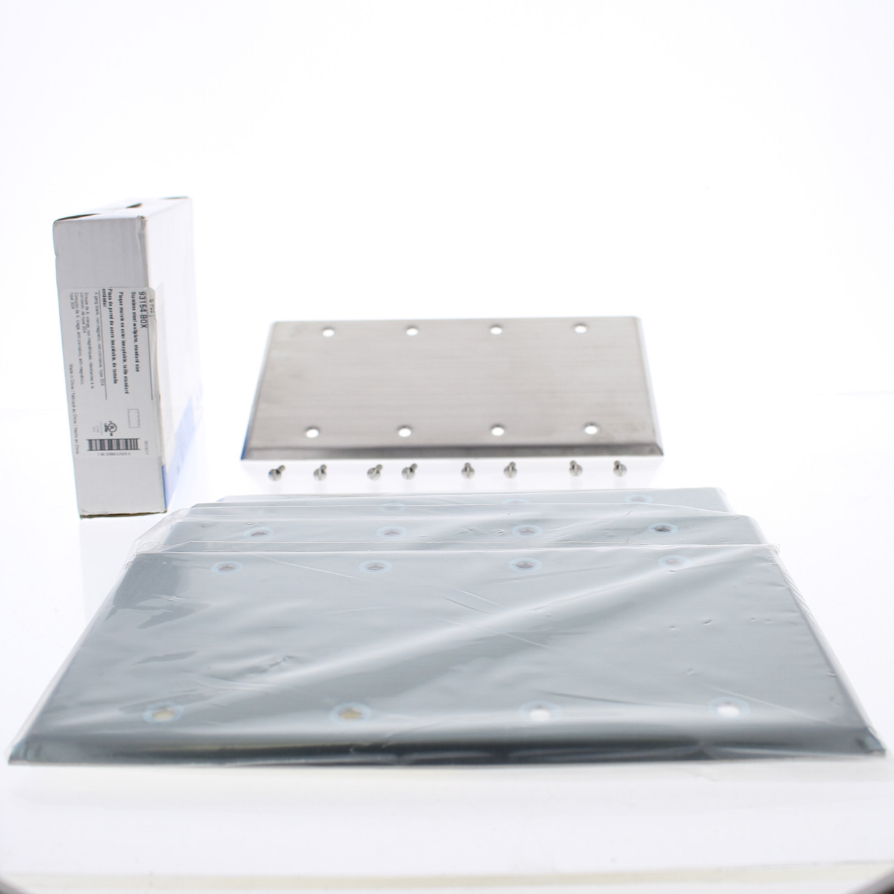 5 Eaton 93154 non-magnetic stainless steel blank wallplates. Commercial Grade, 4-gang box-mount cover; made of type 304 stainless steel - special non-magnetic alloy for sensitive electronic applications (also suitable for regular applications). Standard size, measuring 4.50"H x 8.19"W; brushed satin finish has horizontal orientation. Each is individually packaged; packaging may differ from photo. Features include: