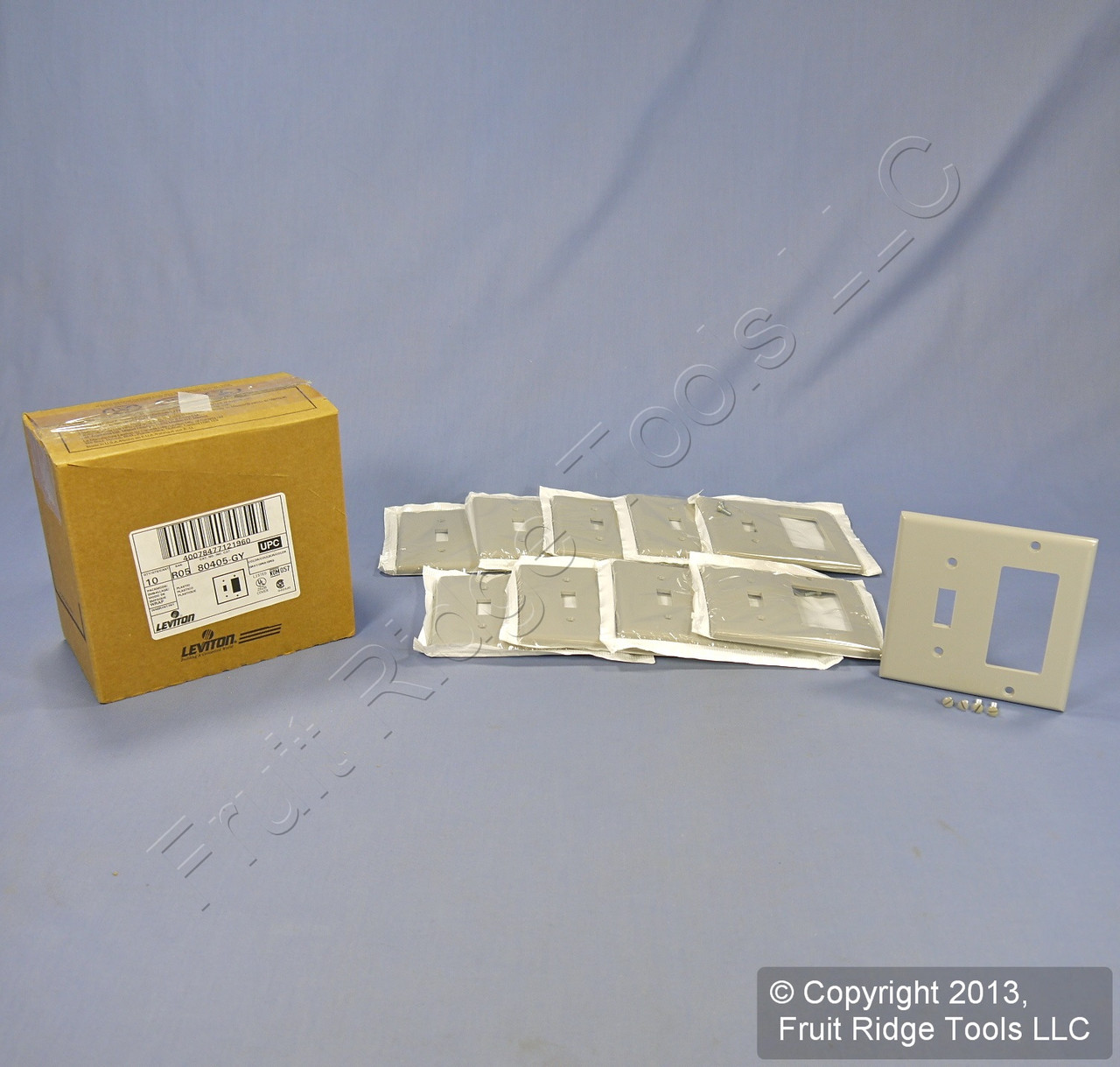 10 Leviton 80405-GY gray combination Decora and toggle switch wallplates. Residential Grade, standard size (4.5"h x 4.56"w) with a rectangular opening that will fit Decora or GFCI devices. Features include: