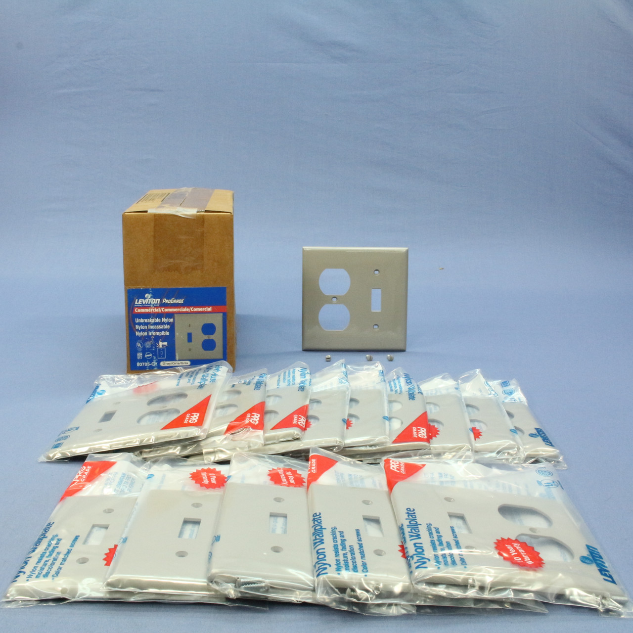 15 Leviton 80705-GY gray 2-gang wallplates. Commercial grade, standard size plate with one switch and one duplex receptacle opening. Made of a high performance unbreakable thermoplastic material - do not confuse this with regular Residential Grade wallplates which can chip or crack. Features include: